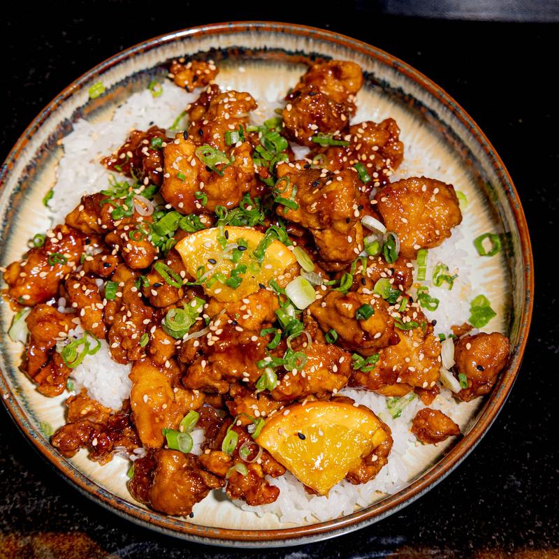 Crispy bites of chicken tossed in sweet soy and house and citrus glaze, over steamed rice.