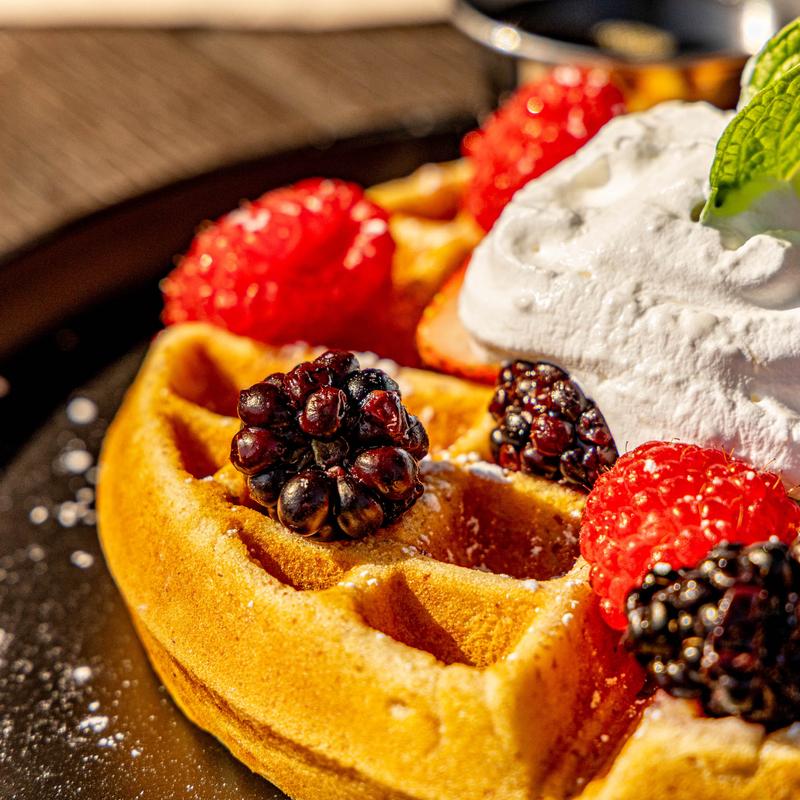 Gluten-free almond flour waffles, topped with fresh fruit, whipped cream, maple syrup, powdered sugar.