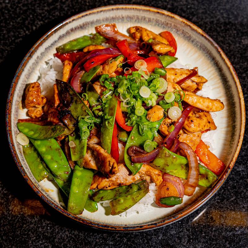 Chicken stir-fried with fragrant Thai herbs and spices, fresh veggies and garlic chili sauce, over steamed rice.