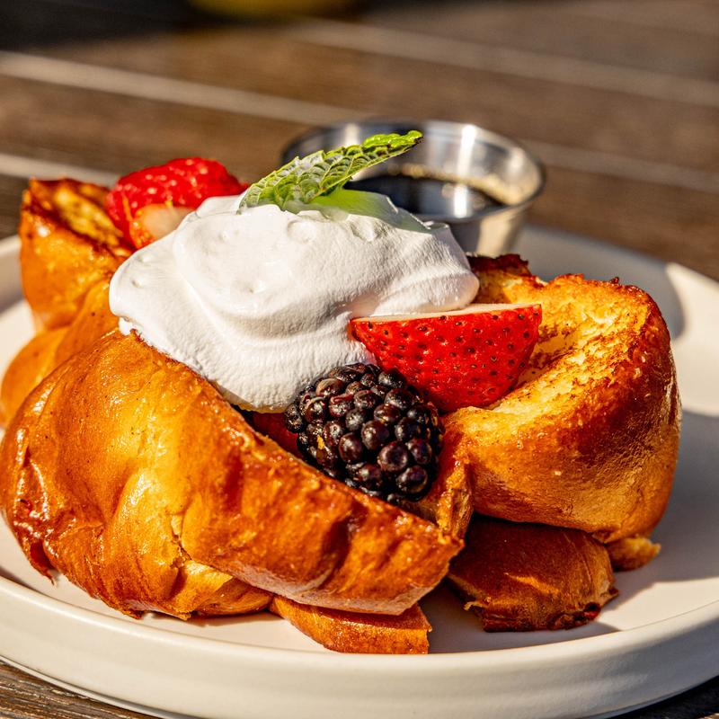 Brioche bread dipped in egg, milk, and cinnamon, topped with whipped cream, maple syrup, fresh fruit.