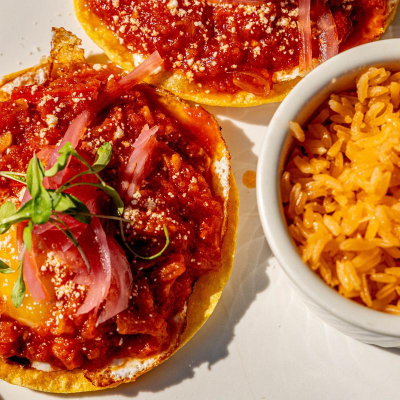 2 fried eggs, beans, rice, cheese, cilantro, onions, sour cream, salsa roja on a tostada.